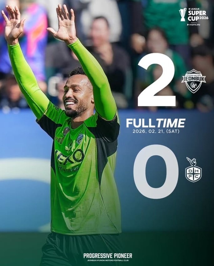 2月21日讯 韩国超级杯今日打响,交手双方分别是上赛季联赛冠军全北现代和联赛亚军大田市民(因全北现代包揽上赛季联赛和杯赛冠军,超级杯由联赛亚军参赛),最终全北现代2-0击败对手,夺得新赛季首冠。