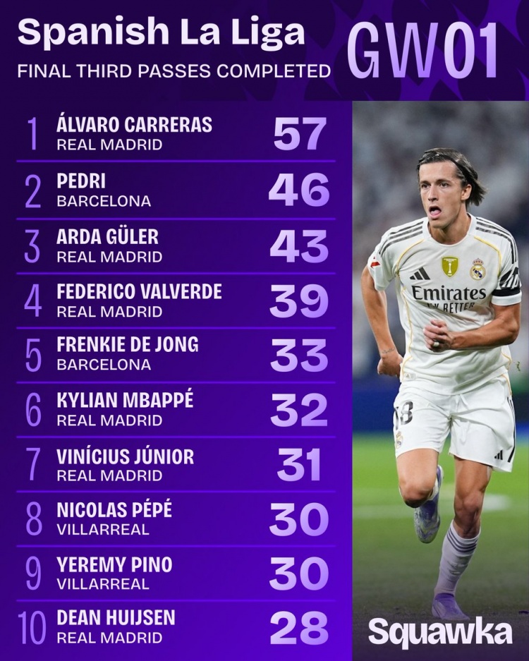 8月21日讯 西甲首轮战罢,Squawka统计球员在进攻三区完成传球次数,A费57次居首,佩德里、居勒尔分列二三位。
