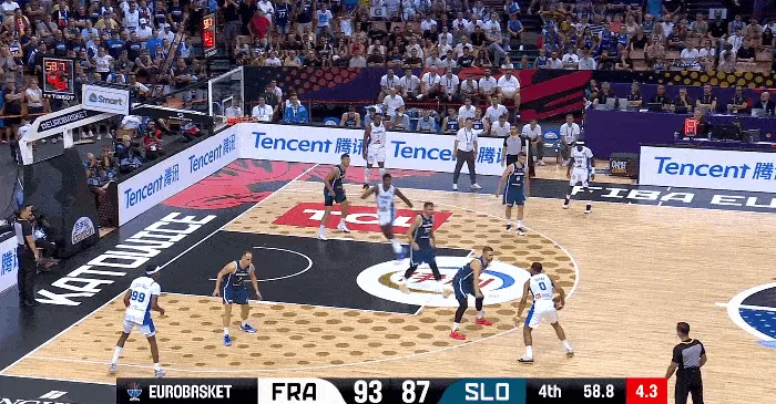 第四节比赛中,奥科博三分投进,法国剩1分钟领先斯洛文尼亚9分。
